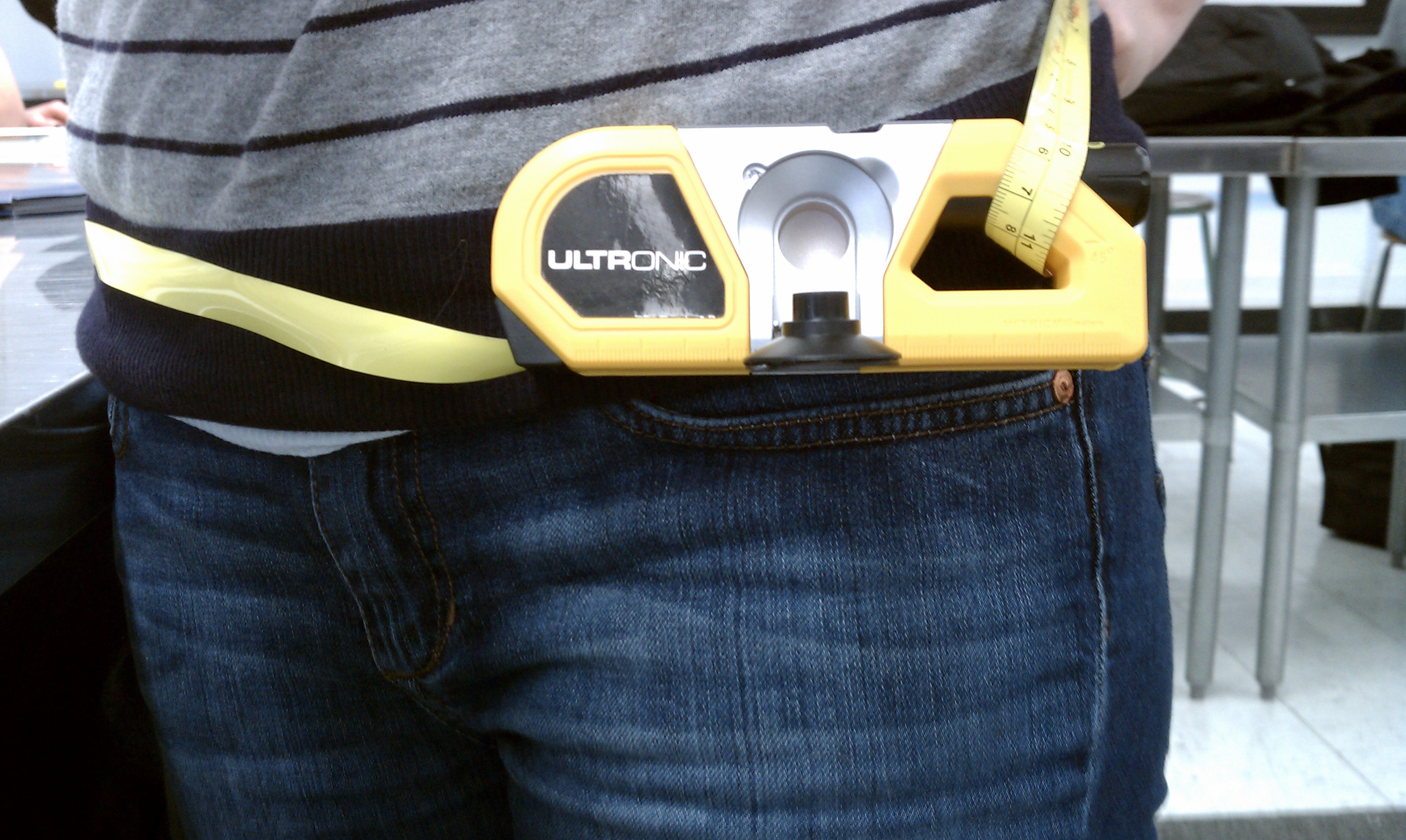 This would be the perfect object/gadget for a rave goer. The laser measure component is utilized as the user is dancing around at the rave. The tape-measure can be used to wear the object, either as a necklace or a belt, as shown below.